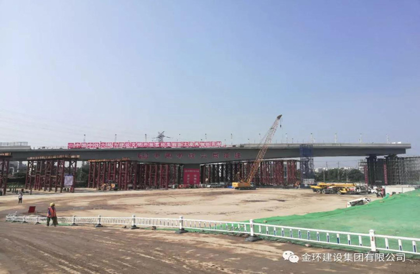 金环讯 据金环建设集团桥梁公司太原项目部提供消息,2018年7月26日凌晨3点,由中铁六局总包金环建设集团桥梁公司分包并承建的太原新店街钢箱梁桥,成功吊装转体41度,零误差对接成功。
