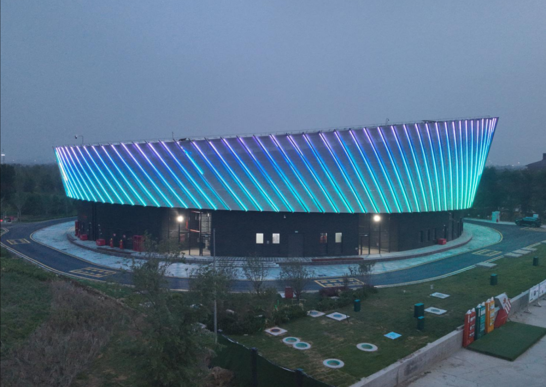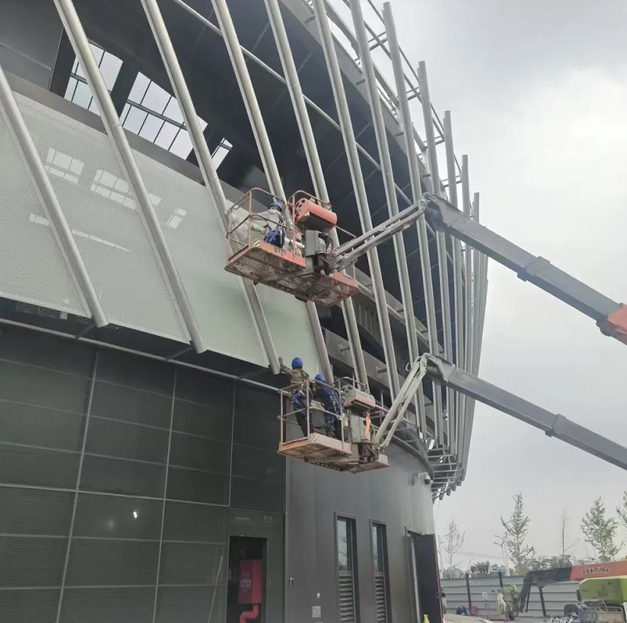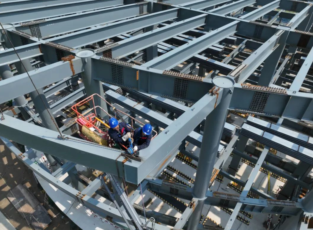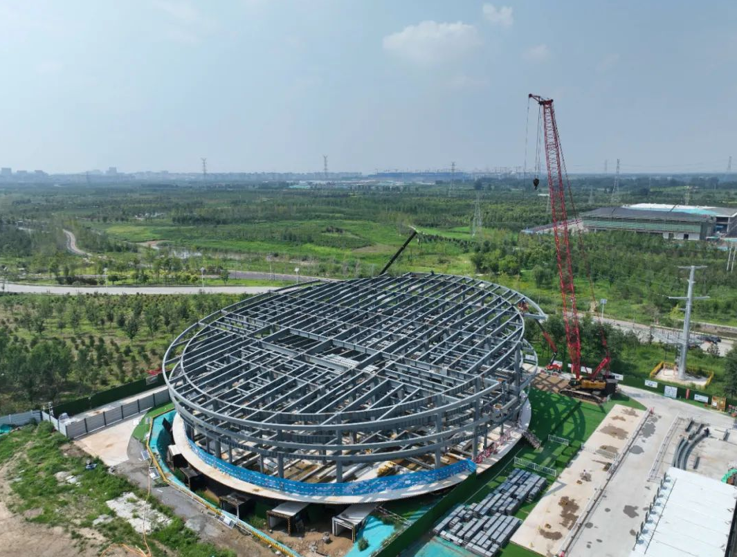复兴220千伏变电站是雄安新区启动区首座独立220千伏变电站,也是全国首座圆形钢结构变电站。该项目钢结构加工和安装各项标准要求较高,曲面梁安装精度控制难度大,异形双曲铝板幕墙施工技术要求高。金环钢结构精心制造、精益施工,顺利实现项目完工交付。